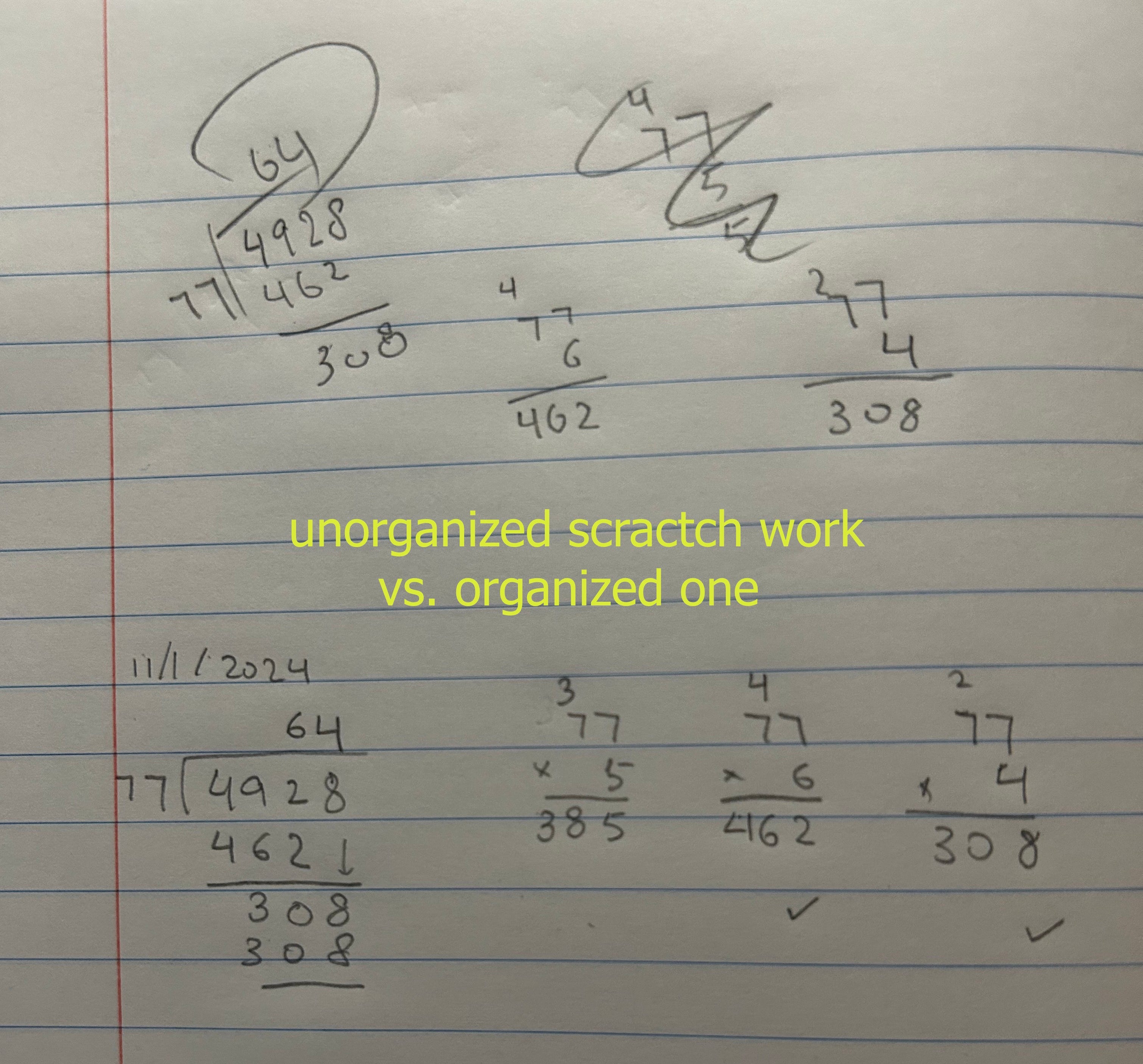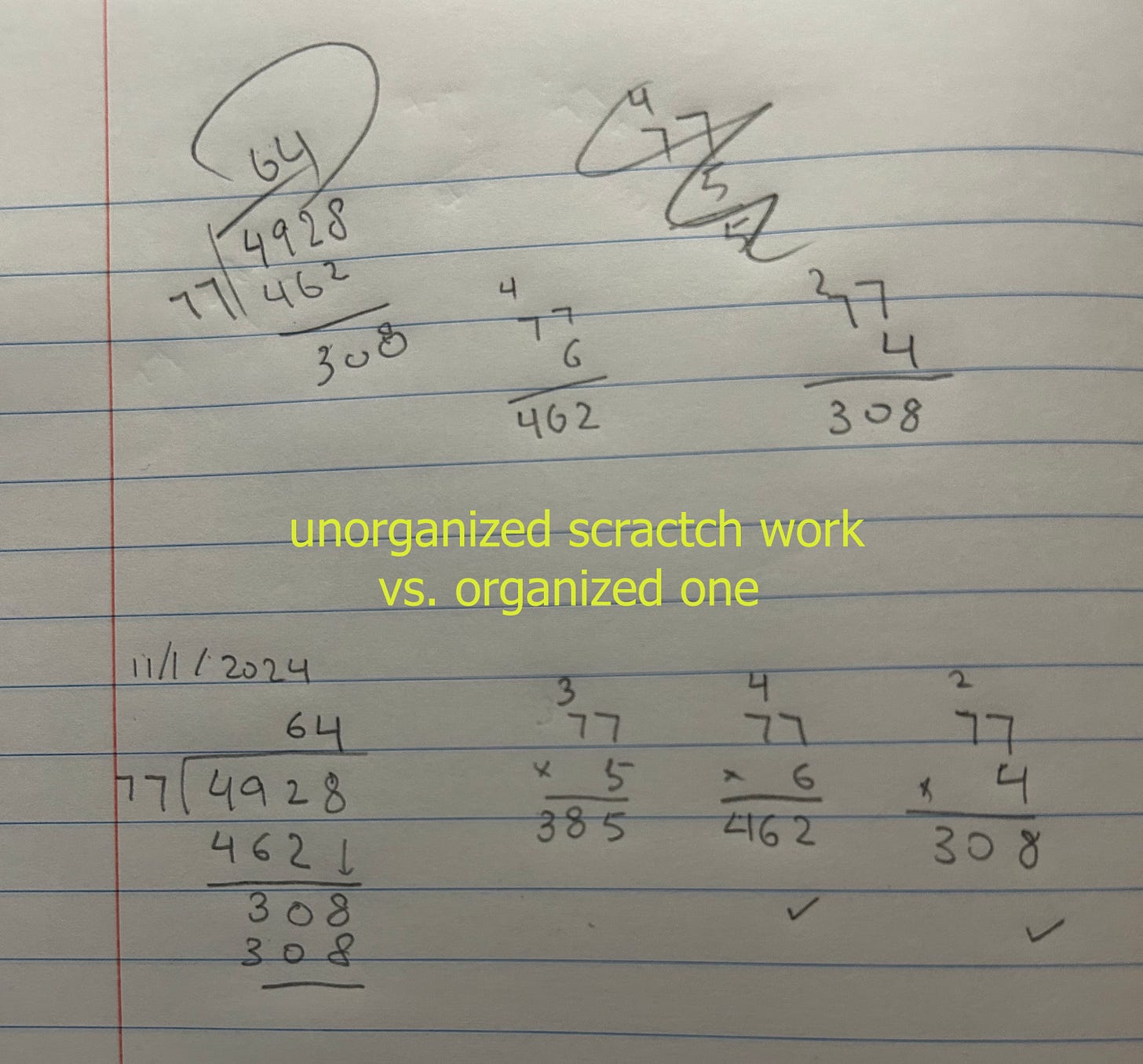 In the next two articles, I will provide suggestions on how to maintain neat and organized math scratch work, as well as how to handle mistakes effectively. The main long-term goal is for students to develop the habit of reviewing their own mathematical reasoning, recognizing their strengths and weaknesses, and guiding themselves toward growth.